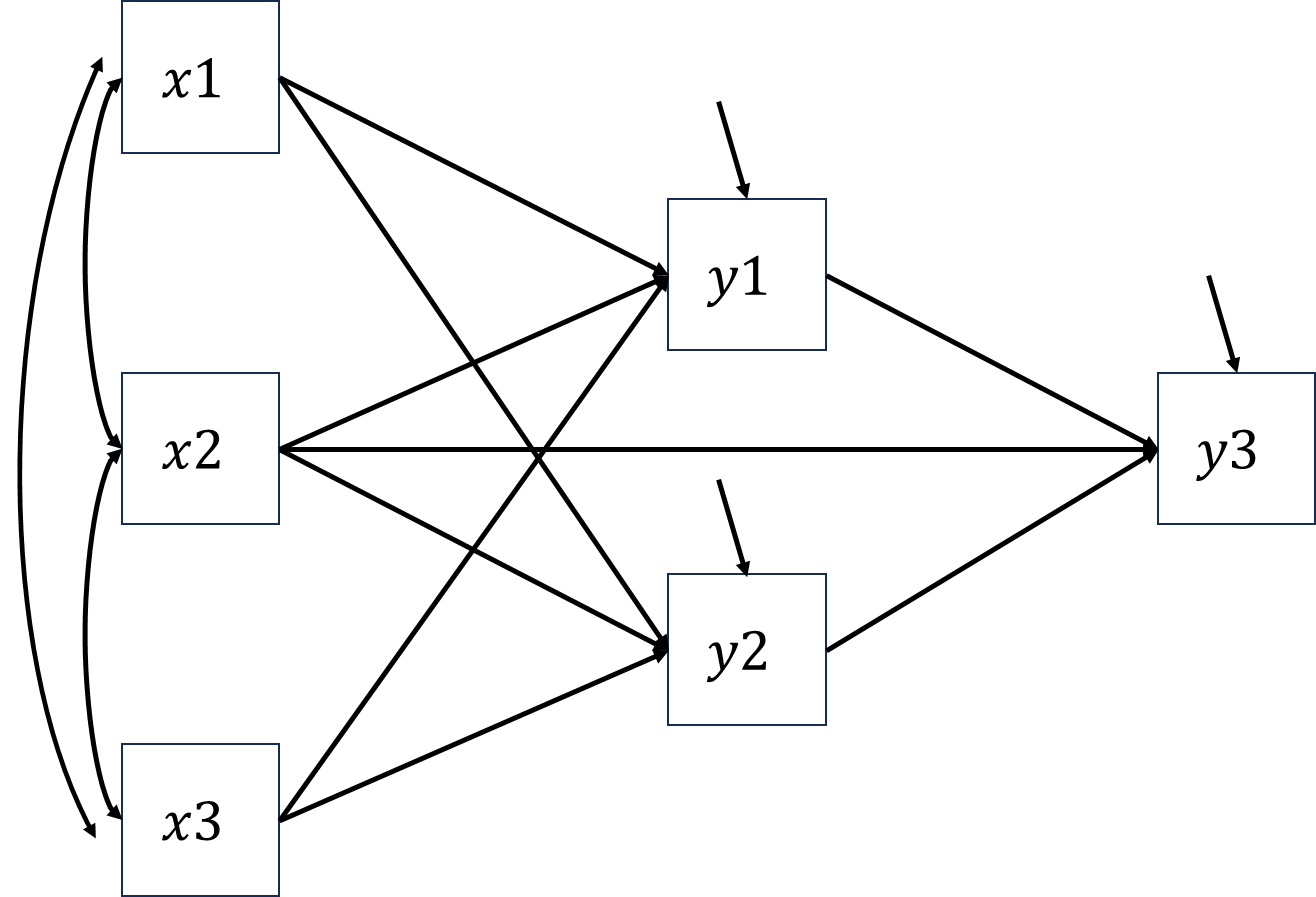 If \(df>0\), the number of freely estimated parameters is less than the number of unique equations, this is the so-called over-identified model. For example, if we assumed \(x_2\) has not impact on \(y\) and fixed \(\hat{\beta}_{x_2y}=0\) (impose restriction on \(\hat{\beta}_{x_2y}\)), the number of parameters to be freely estimated decreases by 1, we end up with 1 more \(df\).
